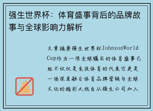 文章摘要的内容:本文探讨超级杯与世界杯如何在全球足球舞台上联动,深入分析其历史发展及未来趋势。通过对比两大赛事的背景、影响力和赛事组织等方面,揭示它们在全球足球文化和商业发展中的角色与影响。1、历史发展与影响超级杯和世界杯作为全球最重要的足球赛事,其历史发展深深影响了现代足球的演变。从它们的创立初衷、赛事组织到国际足联对其政策的影响,探讨超级杯和世界杯如何在历史上相互影响并推动全球足球的普及和竞技...